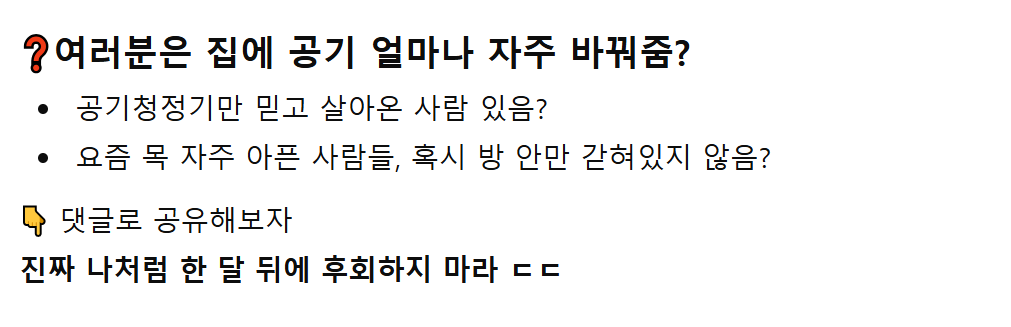 의외로 몰랐다는 공기청정기의 비밀 admin007 댓글 남기기 이 포스팅은 쿠팡 파트너스 활동의 일환으로, 이에 따른 일정액의 수수료를 제공받습니다. 글 네비게이션 이전 글친구 커플이랑 넷이서 같이 살게 됐는데 친구 여친이 이상한 제안을 했다…다음 글변호사에게 시비건 취객의 최후 답글 남기기 응답 취소이메일 주소는 공개되지 않습니다. 필수 필드는 *로 표시됩니다댓글 * 이름 * 이메일 * 웹사이트 다음 번 댓글 작성을 위해 이 브라우저에 이름, 이메일, 그리고 웹사이트를 저장합니다. shgus001@gmail.com