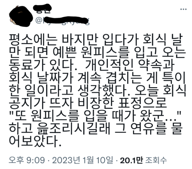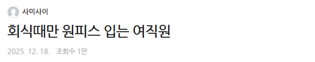 회식때만 원피스 입는 여직원 admin007 댓글 남기기 이 포스팅은 쿠팡 파트너스 활동의 일환으로, 이에 따른 일정액의 수수료를 제공받습니다. 글 네비게이션 이전 글상사에게 평생 감사하다는 사람다음 글층간소음 복수했다가 수갑 찬 썰… 답글 남기기 응답 취소이메일 주소는 공개되지 않습니다. 필수 필드는 *로 표시됩니다댓글 * 이름 * 이메일 * 웹사이트 다음 번 댓글 작성을 위해 이 브라우저에 이름, 이메일, 그리고 웹사이트를 저장합니다. shgus001@gmail.com