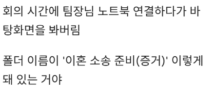 팀장님 컴퓨터에 ‘이혼 서류’ 폴더 있길래 모른 척했는데 admin007 댓글 남기기 이 포스팅은 쿠팡 파트너스 활동의 일환으로, 이에 따른 일정액의 수수료를 제공받습니다. 글 네비게이션 이전 글입원실 커튼뒤로 들려오는 신ㅇ소리의 정체다음 글해외직구 할 때 조심해야 하는 것ㄷㄷ 답글 남기기 응답 취소이메일 주소는 공개되지 않습니다. 필수 필드는 *로 표시됩니다댓글 * 이름 * 이메일 * 웹사이트 다음 번 댓글 작성을 위해 이 브라우저에 이름, 이메일, 그리고 웹사이트를 저장합니다. shgus001@gmail.com