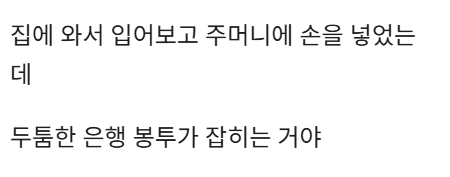 중고로 산 패딩 주머니에서 나온 봉투의 정체 admin007 댓글 남기기 이 포스팅은 쿠팡 파트너스 활동의 일환으로, 이에 따른 일정액의 수수료를 제공받습니다. 글 네비게이션 이전 글버스안에서 경험한 모르는 누나의 손놀림다음 글롱패딩 입고 방귀 뀌면 안 되는 진짜 이유 ㄷㄷ 답글 남기기 응답 취소이메일 주소는 공개되지 않습니다. 필수 필드는 *로 표시됩니다댓글 * 이름 * 이메일 * 웹사이트 다음 번 댓글 작성을 위해 이 브라우저에 이름, 이메일, 그리고 웹사이트를 저장합니다. shgus001@gmail.com