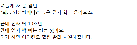 여름철 차 열기 가장 빠르게 빼는 꿀팁 pkmkt 댓글 남기기 이 포스팅은 쿠팡 파트너스 활동의 일환으로, 이에 따른 일정액의 수수료를 제공받습니다. 글 네비게이션 이전 글일반인은 못 들어가는 이집트 피라미드 내부 탐험한 미스터 비스트다음 글피부관리샵에서 누워있는데, 직원 손이 그곳에… 답글 남기기 응답 취소이메일 주소는 공개되지 않습니다. 필수 필드는 *로 표시됩니다댓글 * 이름 * 이메일 * 웹사이트 다음 번 댓글 작성을 위해 이 브라우저에 이름, 이메일, 그리고 웹사이트를 저장합니다. shgus001@gmail.com
